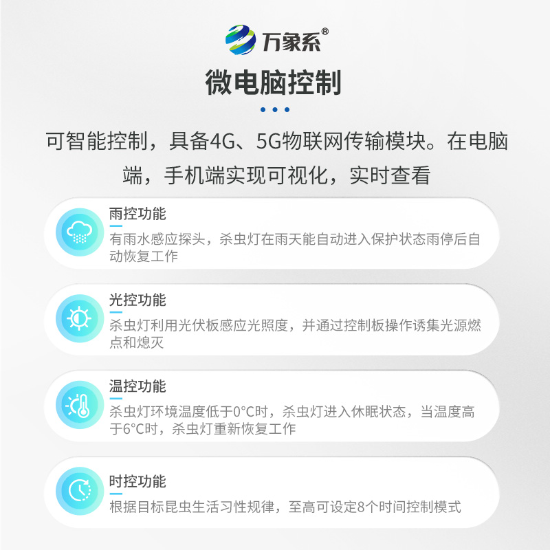 5.雨控功能:有雨水感應探頭,殺蟲燈在雨天能自動進入保護狀態,雨停后自動恢復工作;